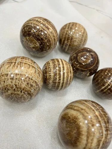 A banded brown aragonite polished sphere sounds like a beautiful piece! Aragonite is a type of carbonate mineral that forms in various colors and patterns, including bands of brown. When polished into a sphere shape, it likely showcases those bands in an elegant and intriguing way. Aragonite is believed to have grounding and stabilizing properties, making it not only visually appealing but also potentially beneficial for creating a calming atmosphere or aiding in meditation. It would make a lovely addition to any collection or as a decorative piece in a home or office.
